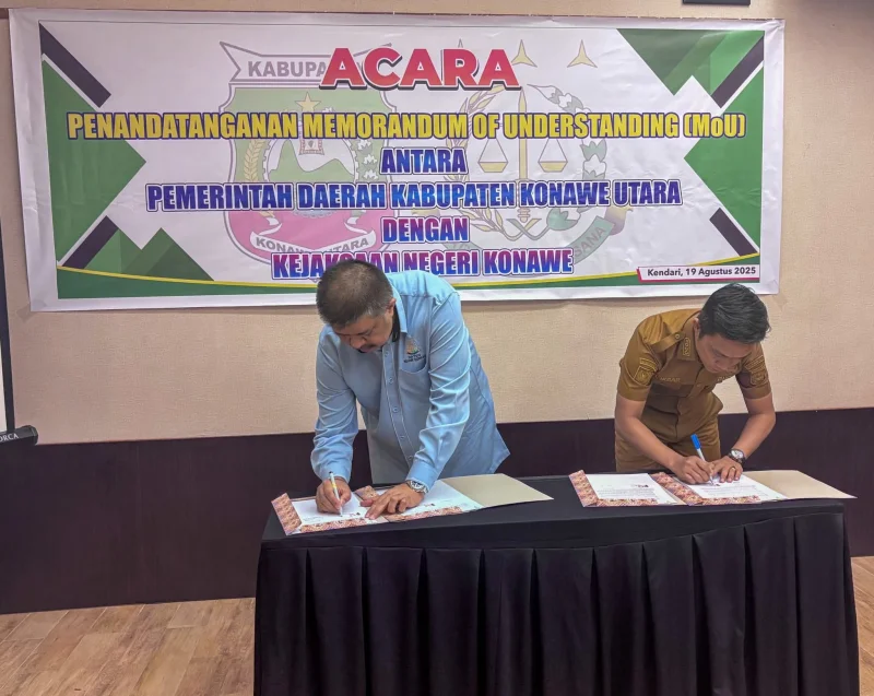 Indosultra.com, Kendari – Dalam upaya memperkuat tata kelola pemerintahan yang bersih, transparan, dan berlandaskan hukum, Bupati Konawe Utara, H. Ikbar, SH., MH, bersama Kepala Kejaksaan Negeri (Kajari) Konawe, Fachrizal, SH menandatangani Nota Kesepahaman (MoU) terkait Penanganan Masalah Hukum Bidang Perdata dan Tata Usaha Negara (TUN). Kegiatan tersebut berlangsung disalah satu Hotel di Kendari, pada Selasa (19/8/2025).