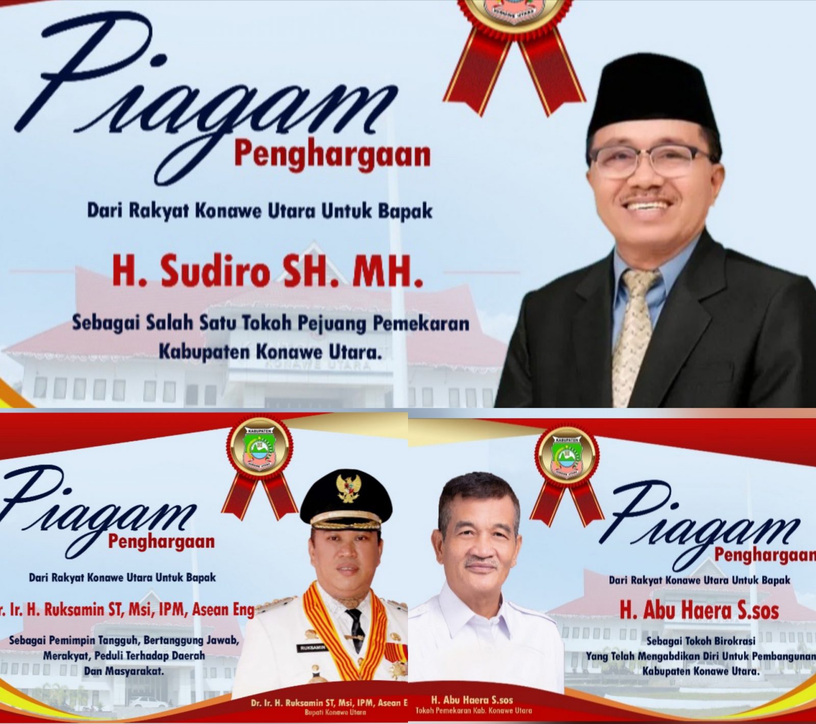 Indosultra.Com, Konawe Utara-Rakyat Kabupaten Konawe Utara (Konut), Sulawesi Tenggara (Sultra) memberikan penghargaan sebagai tanda jasa kepada Sudiro, Ruksamin dan Abu Haera. Pelakat yang diserahkan dari para tokoh-tokoh masyarakat itu, sebagai bentuk penghormatan atas jasa-jasa selama mengabdikan diri di Bumi Oheo.