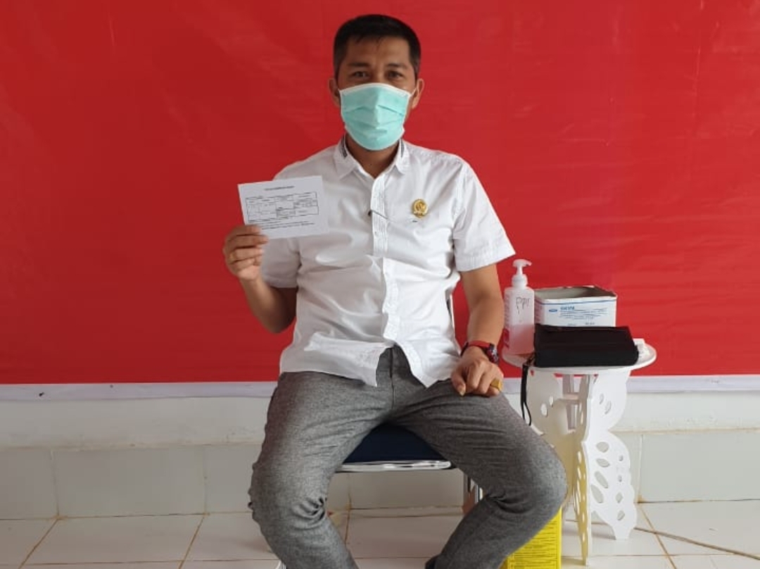Ketgam: Anggota DPRD Konut, Abdul Malik mewakili Ketua DPRD Konut saat melakukan vaksin covid-19 tahap ll di RSUD Konut. (Indosultra.Com).