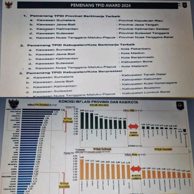 Dalam Rakorpusda tersebut, Dirjen Bina Pembangunan Daerah Kemendagri, Ir Restuardy Daud MSc memaparkan, 10 Provinsi terendah inflasi tersebut yakni posisi pertama oleh Babel, NTT, Papua, Papua Selatan, Kalteng, Kalbar, Sultra, Sulsel, Papua Barat Daya, dan Kalsel.