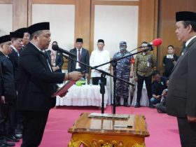 Bupati Konut, Ruksamin saat melakukan proses pelantikan pejabat eselon ll hasil seleksi terbuka jabatan tinggi Pratama lingkup Pemerintah Kabupaten Konawe ...