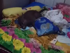 Ketgam: Dokumentasi seekor babi berukuran besar dan berbulu hitam saat tertidur lelap di atas ranjang kamar milik seroang warga di ...