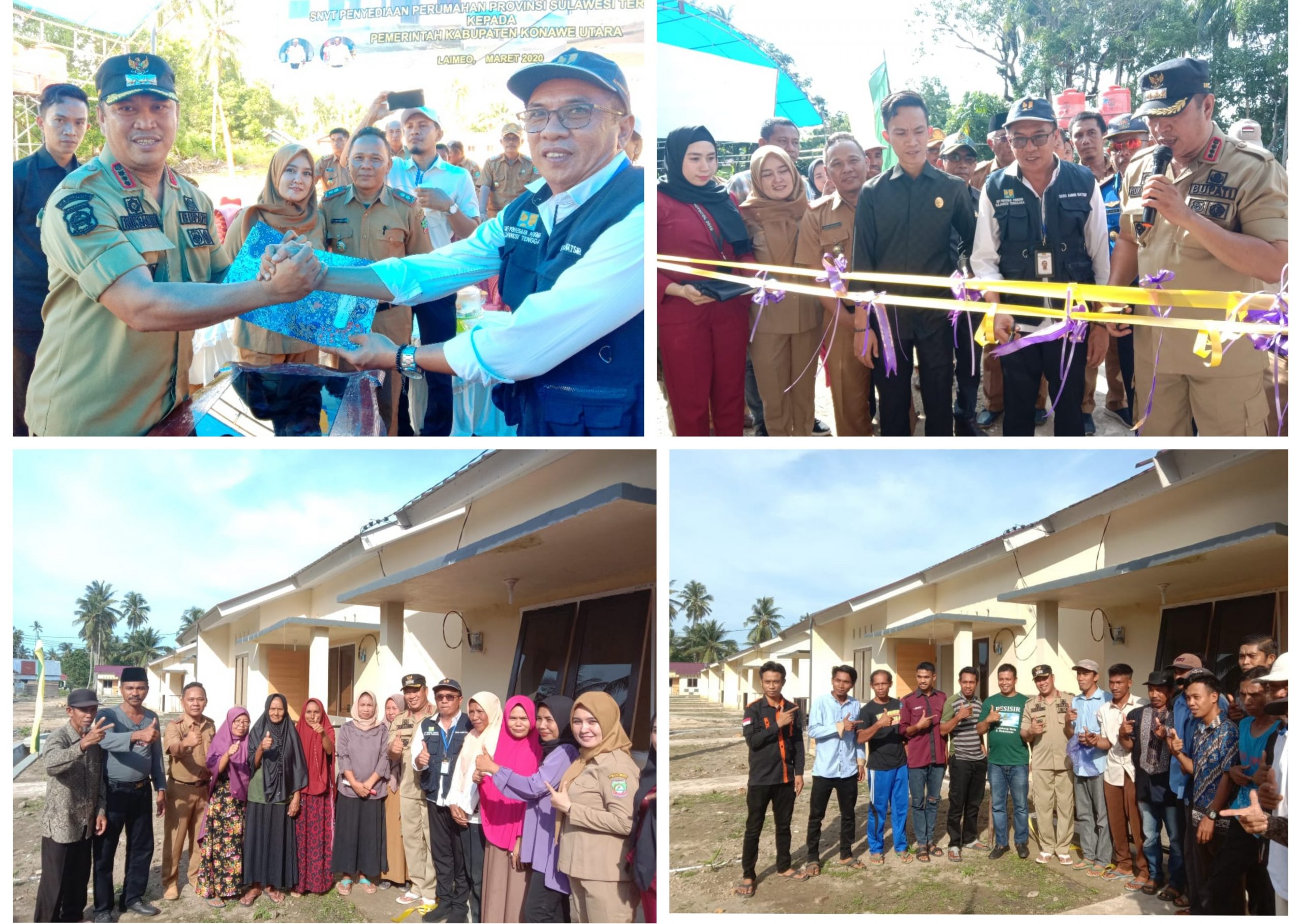 Ketgam: Bupati Konut, Ruksamin bersama Ketua DPRD Konut dan jajaran Dispermukim Konut saat meresmikan bangunan rumah baru untuk masyarakat nelayan di Laimeo.(Indosultra.Com).