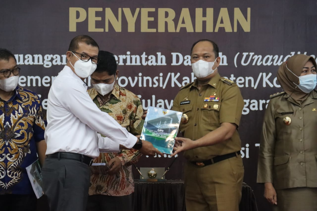 Ketgam: Bupati Konut, Ruksamin saat menyerahkan LKPD Tahun 2020 di Kantor BPK Perwakilan Sultra yang diterima langsung Kepala BPK Perwakilan Sultra, Andi Sonny. (Indosultra.Com).