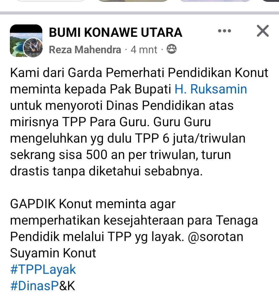 Status yang diunggah Akun Facebook Reza Mahendra di Group Facebook Bumi Konawe Utara bertuliskan atas nama Garda Pemerhati Pendidikan Konawe Utara meminta Bupati Konut, Ruksamin untuk menyoroti Dinas Pendidikan terkait siap dana Tambahan Penghasilan Pegawai (TPP) para guru diwilayah itu.