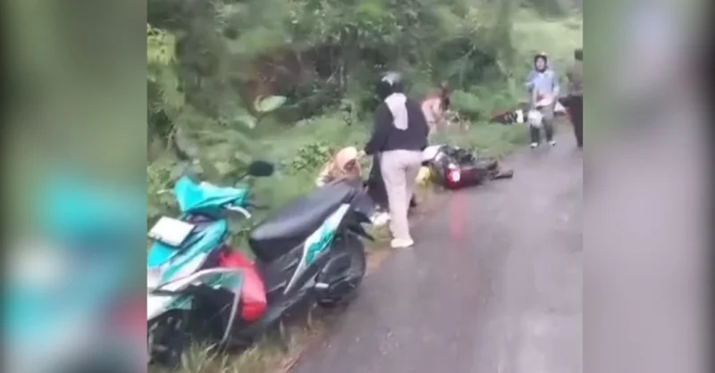 Dalam video tersebut, para korban tampak kesakitan setelah terjatuh. Seorang wanita di lokasi kejadian dengan sigap memperingatkan pengendara lain untuk berhati-hati.