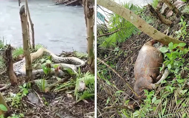 Indosultra.com, Kolaka Utara – Sosial media dihebohkan dengan seekor ular piton memakan sapi di dalam hutan disamping sungai.