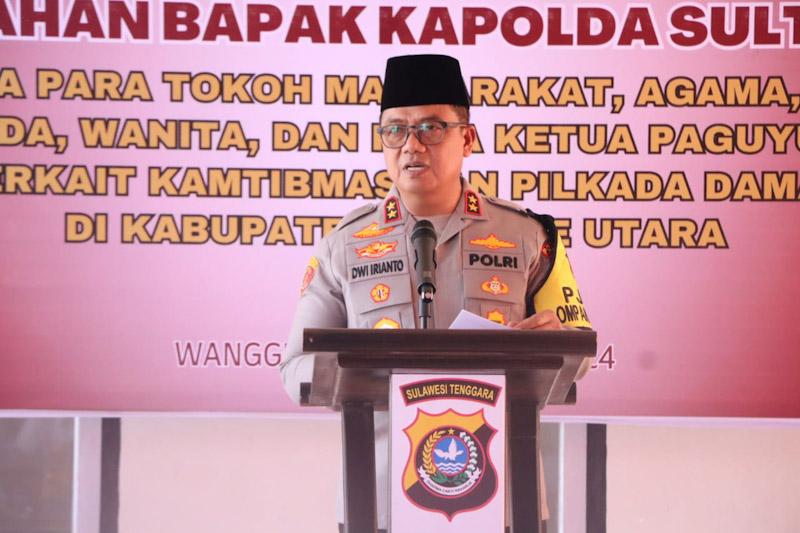 Indosultra.Com, Konawe Utara – Arahan tersebut diberikan langsung oleh Kapolda Sultra Irjen Pol Dwi Irianto, S.I.K., M.Si kepada tokoh masyarakat, tokoh adat, tokoh agama, tokoh pemuda dan ketua paguyuban dalam rangka harkamtibmas dan Pilkada damai di Kabupaten Konawe Utara, Senin 18 November 2024.