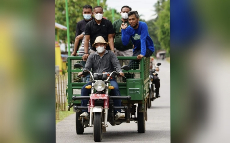 Menyetir langsung motor sampah, Ruksamin yang memakai kaos dan topi berbahan daun kelapa, mengelilingi lokasi pantai membawa ribuan bibit pohon untuk ditanami.
