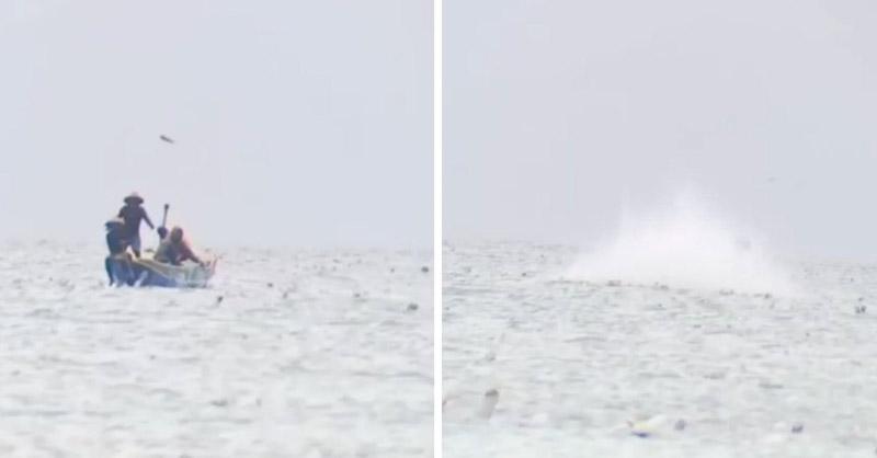 Dalam video tersebut, tampak empat nelayan berada di atas perahu kayu. Salah seorang melemparkan benda yang diduga bom ikan ke laut hingga terdengar ledakan keras.