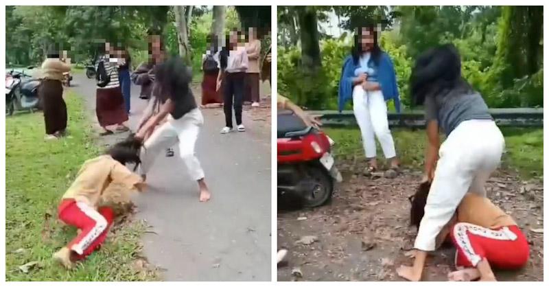 Perkelahian yang terjadi bak seperti petarung smack down, di mana terlihat seorang remaja sekolah putri yang mengenakan pakaian seragam pramuka di jambak rambutnya, di tarik- tarik dan di seret ke aspal.