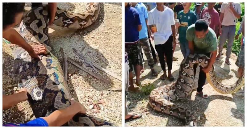 Sehingga sekitar 6 orang warga dengan susah payah mengangkat ular tersebut dikarenakan ukuranya yang panjang dan berat.