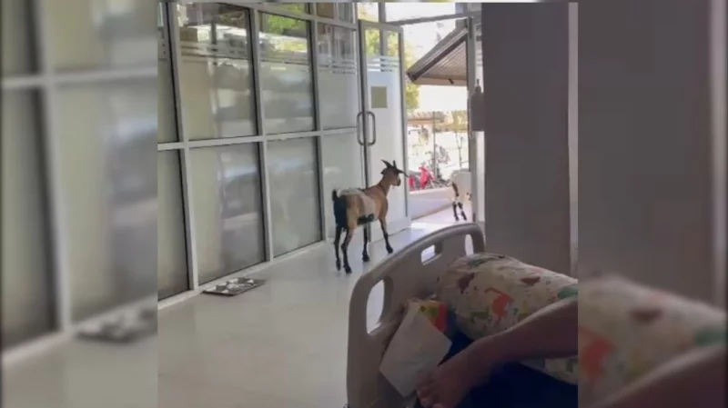 Video berdurasi 11 detik ini memperlihatkan hewan kambing besar berwarna coklat dan putih masuk di ruang perawatan medis.