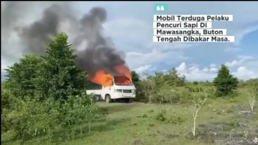 Indosultra.com, Buton Tengah –Warga Desa Wasilomata 2, Kecamatan Mawasangka, Kabupaten Buton Tengah (Buteng), Sulawesi Tenggara, dibuat geger dengan aksi nekat pembakaran satu unit mobil pikap putih yang diduga digunakan untuk mencuri sapi, Jumat (18/4/2025).