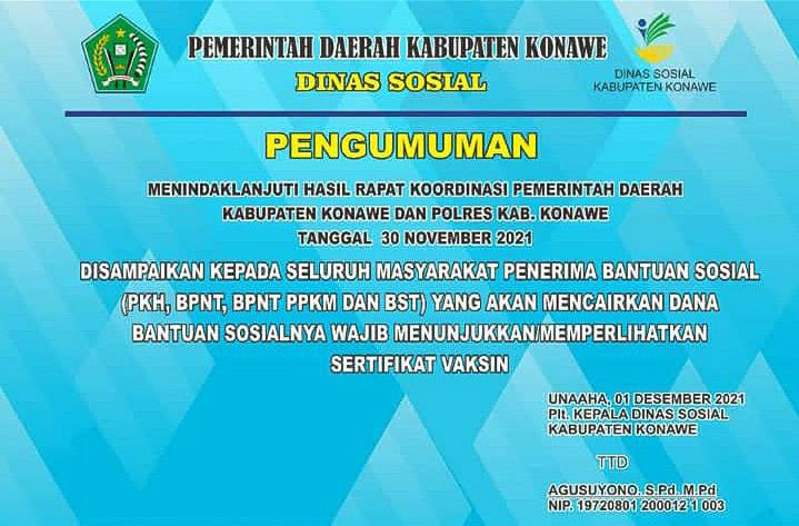 Kepala Dinas Sosial (Dinsos) Kabupaten Konawe Agus Suyono, S.Pd. M.Pd. melalui Kepala Bidang Pelayanan, Pugu Sudiarjo mengatakan bahwa pengumuman yang beredar di Media sosial tersebut merupakan tindak lanjut dari rapat koordinasi pemerintah daerah bersama Polres Konawe tentang peningkatan capaian vaksinasi beberapa hari yang lalu.